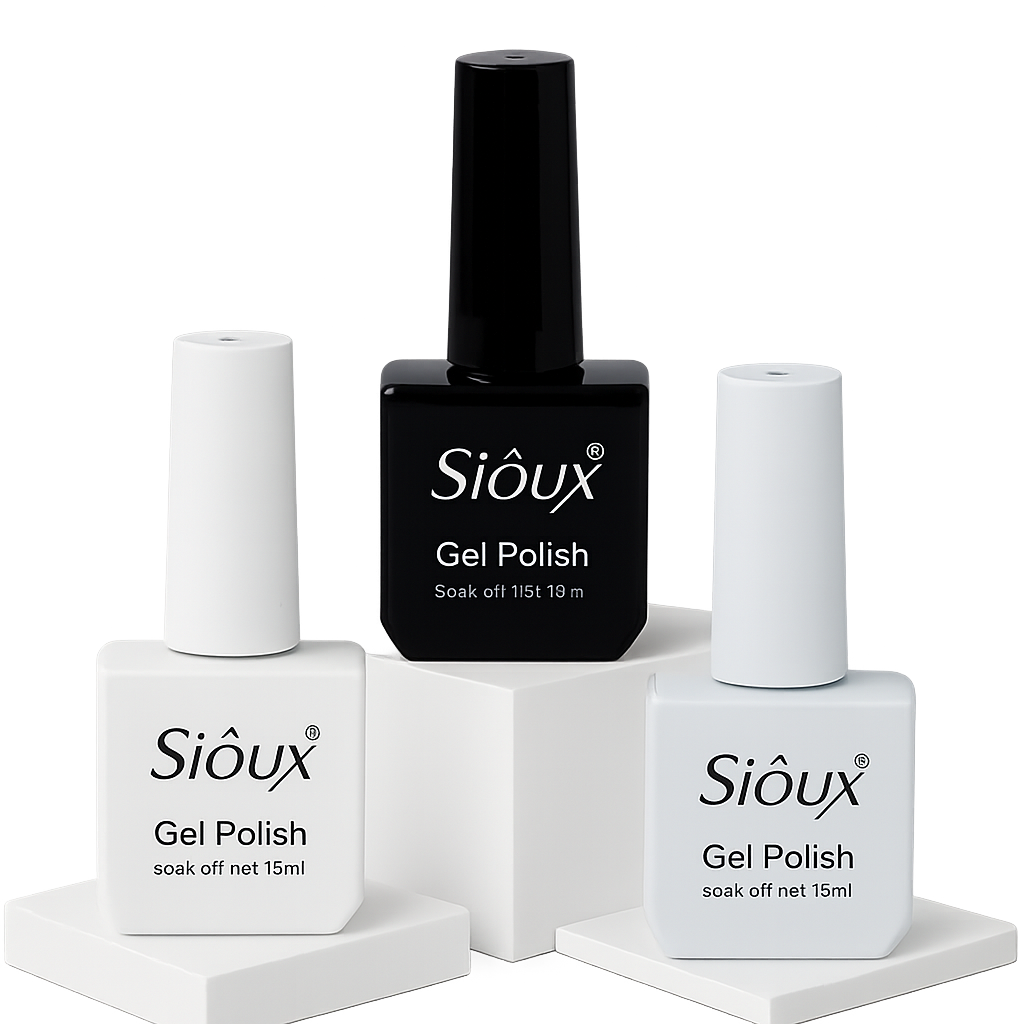 A elegância do branco, a força do preto e a delicadeza do tom leitoso se unem na Coleção Preto e Brancos Sioux. Três esmaltes em gel UV de alta performance, ideais para composições clássicas, nail art ou acabamento sofisticado.
